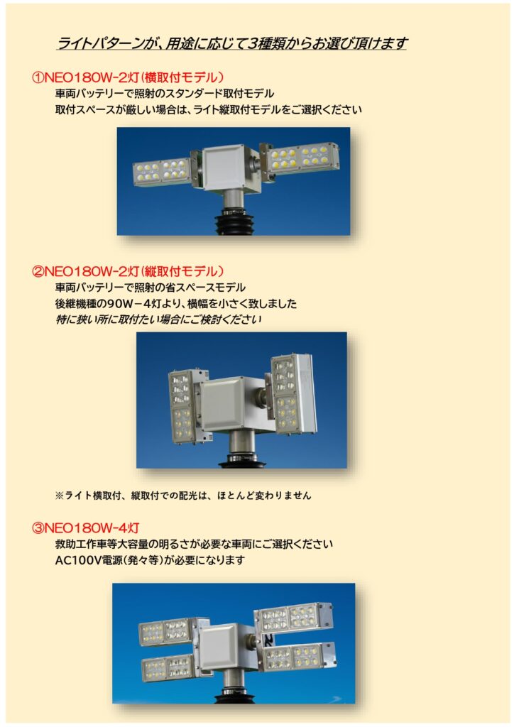救助工作車のメイン照明としてもお使い頂けます
